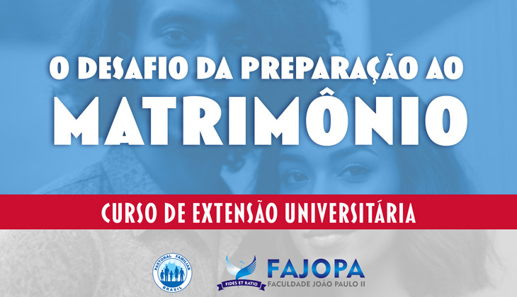 Estão abertas as inscrições para o curso de extensão “Desafios da Preparação ao Matrimônio”, elaborado em parceria pela Comissão Nacional da Pastoral Familiar (CNPF) e a Faculdade João Paulo II (Fajopa). O curso é aberto a toda a comunidade, inclusive para aquelas pessoas que ainda não cursaram a universidade, especialmente catequistas do Pré-Matrimônio e agentes da Pastoral Familiar.