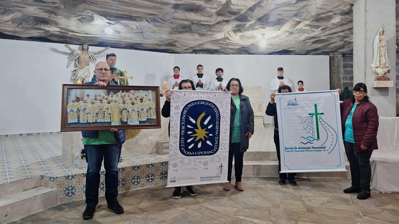 A Diocese de Tubarão iniciou o Mês Vocacional com a celebração da Santa Missa na comunidade Santa Luzia, no KM 60, Paróquia de Oficinas, oficializando o lançamento do Projeto Padres para Igreja em Santa Catarina. A celebração integrou oficialmente a Diocese à proposta do Regional em uma ação comum de fomento às vocações presbiterais. O padre Jean Marcos, animador vocacional da Diocese e integrante do grupo que elaborou o projeto, ressaltou a responsabilidade coletiva na oração pelas vocações. Dom Adilson Pedro Busin, CS, bispo diocesano, reforçou o chamado à participação das comunidades, pastorais e juventude local na caminhada vocacional. “Hoje nós estamos aqui nesta comunidade, para dizer que demos a abertura ao grande projeto, essa jornada, na Igreja de Santa Catarina, o Projeto Padres para a Igreja em Santa Catarina. Quero convidar a todas as comunidades, as equipes vocacionais, os jovens, a animação vocacional aqui de Tubarão, dar uma benção e incentivar a todos os seminaristas, as vocacionadas, os vocacionados, os nossos jovens, também. Que Deus nos anime a caminhar seguindo Jesus”, afirmou o bispo.